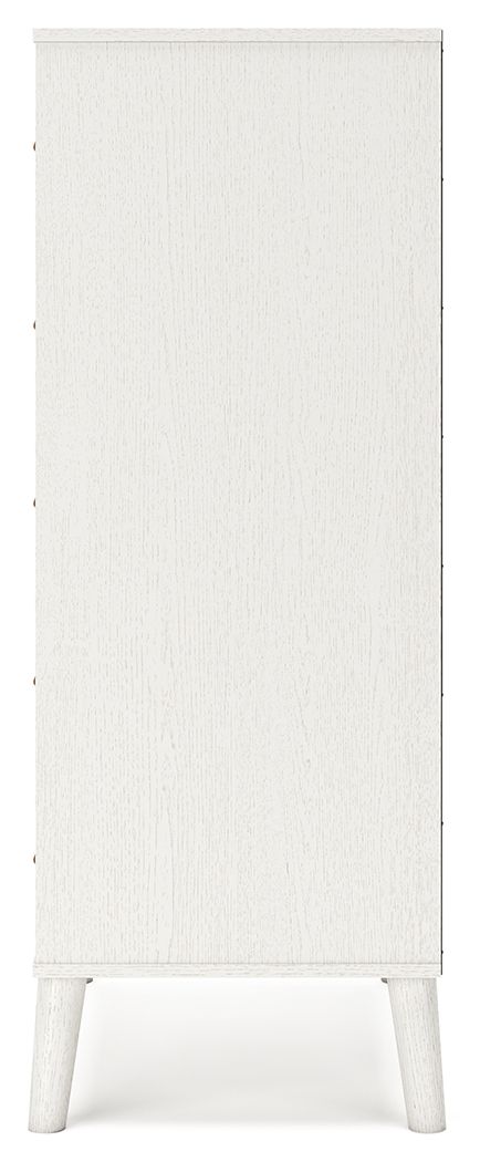 Dare to take minimalism to the max. This chest of drawers has an air of sleek simplicity thanks to its painted finish with subtle replicated wood grain. Magnificently mod splay legs are a compelling complement to the streamlined design. And with two sets of faux leather drawer pulls that allow you to customize the chest to suit your space, there's no doubt about it: This contemporary piece is sure to become a classic.