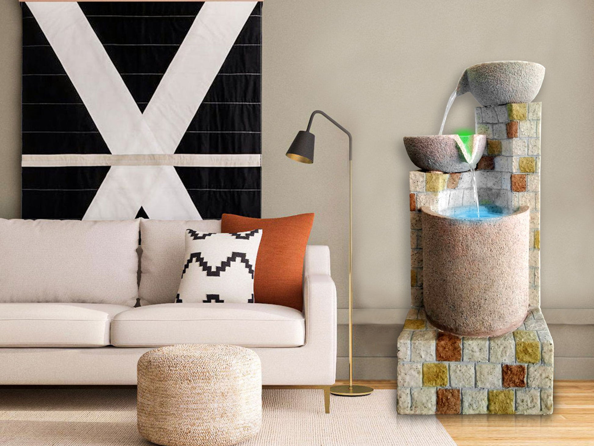 - Fountain has a natural look of beige stone with a cascading stream that can be used indoors and outdoors. Made of durable materials that will perfect your home, yard, and garden decor Design adds a cosmopolitan look, while the relaxing, gentle water falling helps to bring in a natural element Use indoors or outdoors Outdoor use should be covered to protect from the elements when not in use or during inclement weather 13L-15L 7W Water Pump