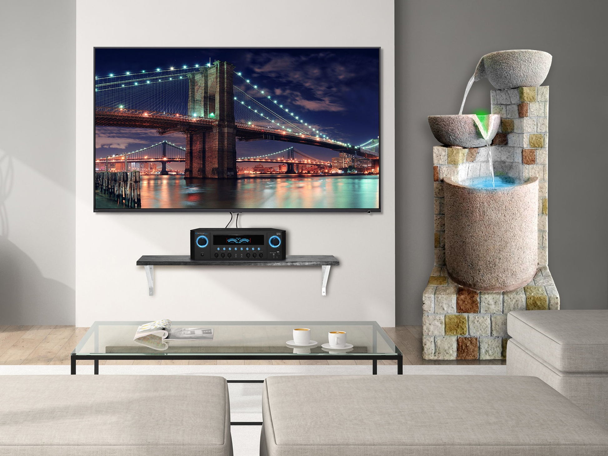 - Adds traquil waterfall sounds to your space LED Lights add a beautiful ambience to the waterfall. Modern technology embodying nature’s water wonders. Contemporary look while creating a relaxing ambiance. The combination of contemporary design mixed with natural elements gives a modern, sleek element to any indoor/outdoor decor.