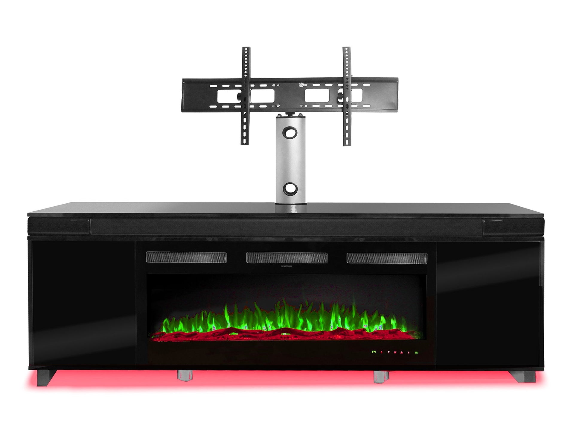 - TV Bracket: Supports 32" - 80” flat-panel TV, VESA bracket:800X500mm (100lb Max) LED Lighting Kit with Remote Control Silver Aluminum Tube for the back. Cable Management Hole hides cables from View. Tilt: +/-15°, Swivel: +/-30° Aluminum and Steel construction for stability 48" CSA CERTIFIED Electronics Fireplace Includes 2 Fire Bed Options 1. Driftwood Logs, 2. Acrylic Crystals secured behind a durable tempered glass with a contemporary black frame.