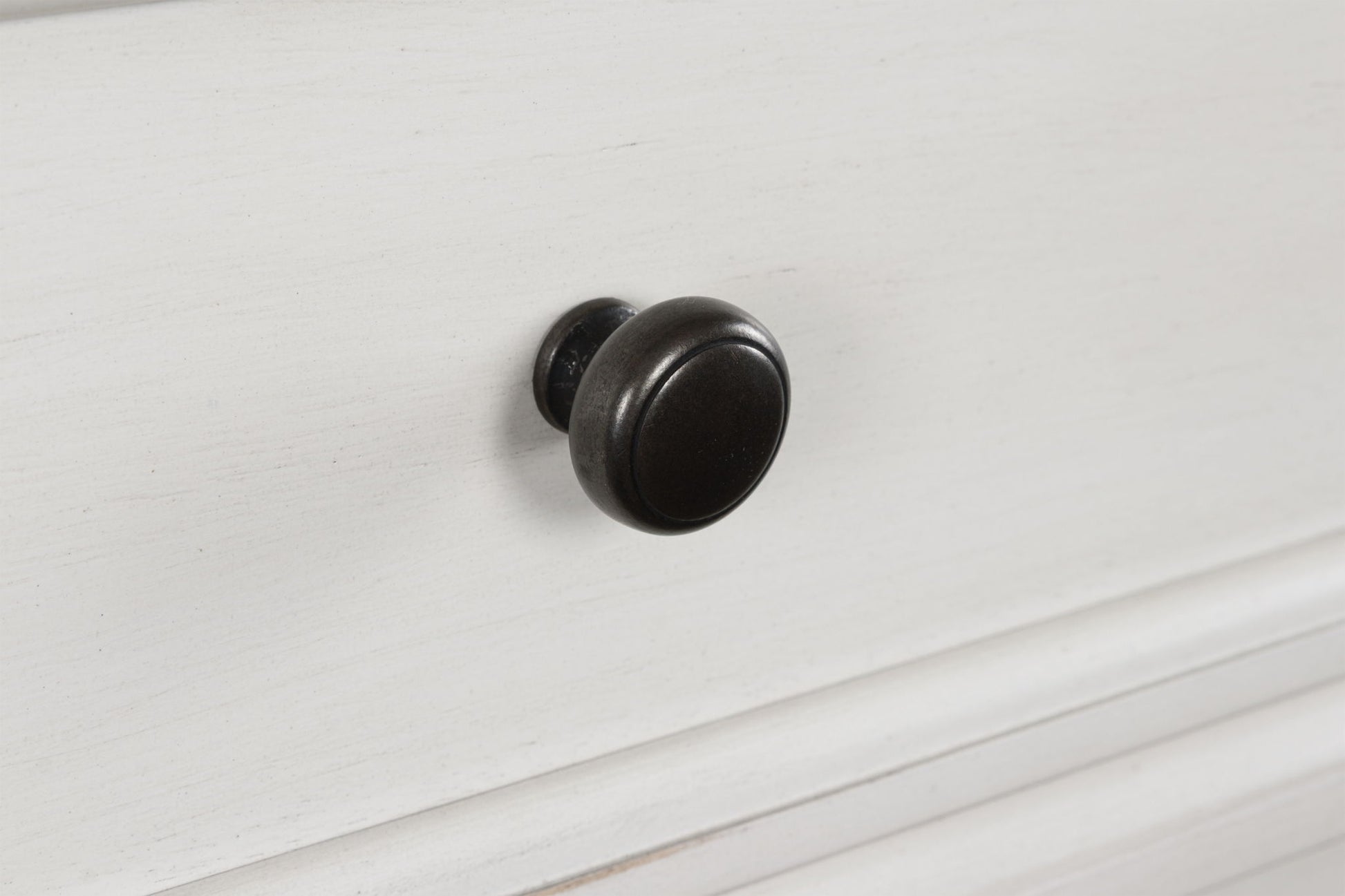 Taking a laid-back approach to casual traditional design, this artfully crafted chest of drawers combines classic elements with a clean modern approach. Its rubbed antiqued finish exudes a comfy, timeless appeal that's sure to carry you away to a dreamy time and place. Simple round metal knobs and ring pulls on the chest's spacious drawers make just the right statement.